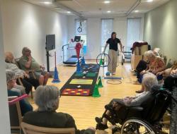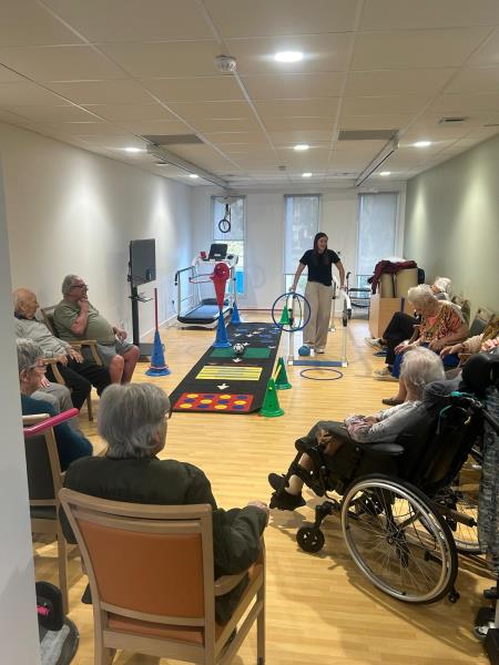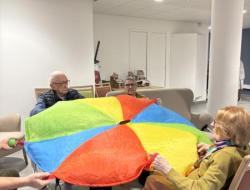 Participation des résidents au groupe de motricité proposé par la psychomotricienne. Ils ont pu mobiliser leur corps à travers différents exercices d'équilibre, de coordination, d'adresse ou encore des parcours psychomoteurs.